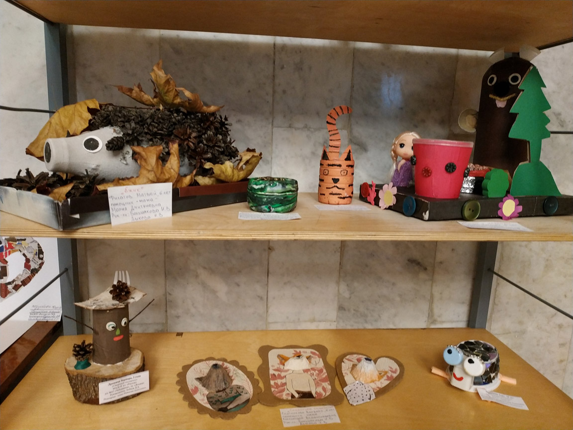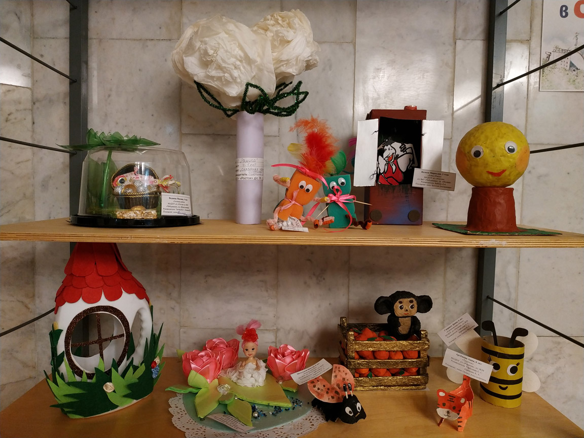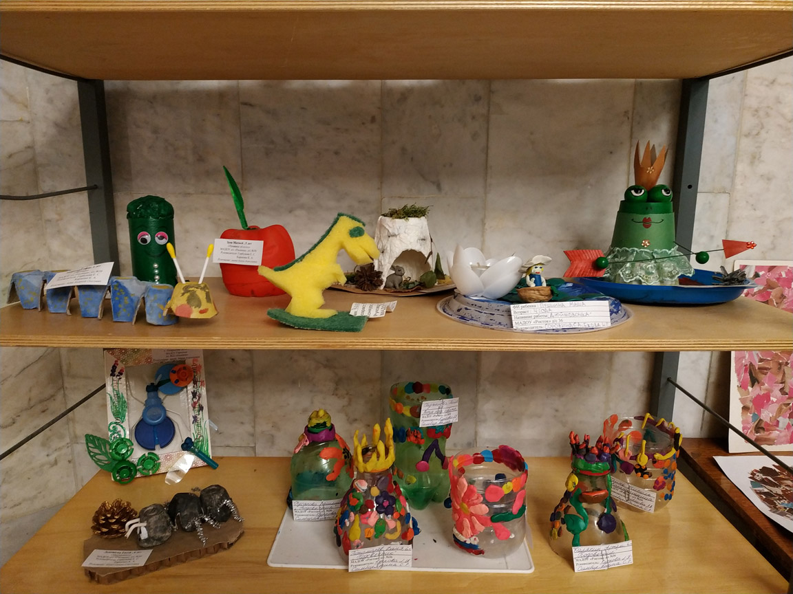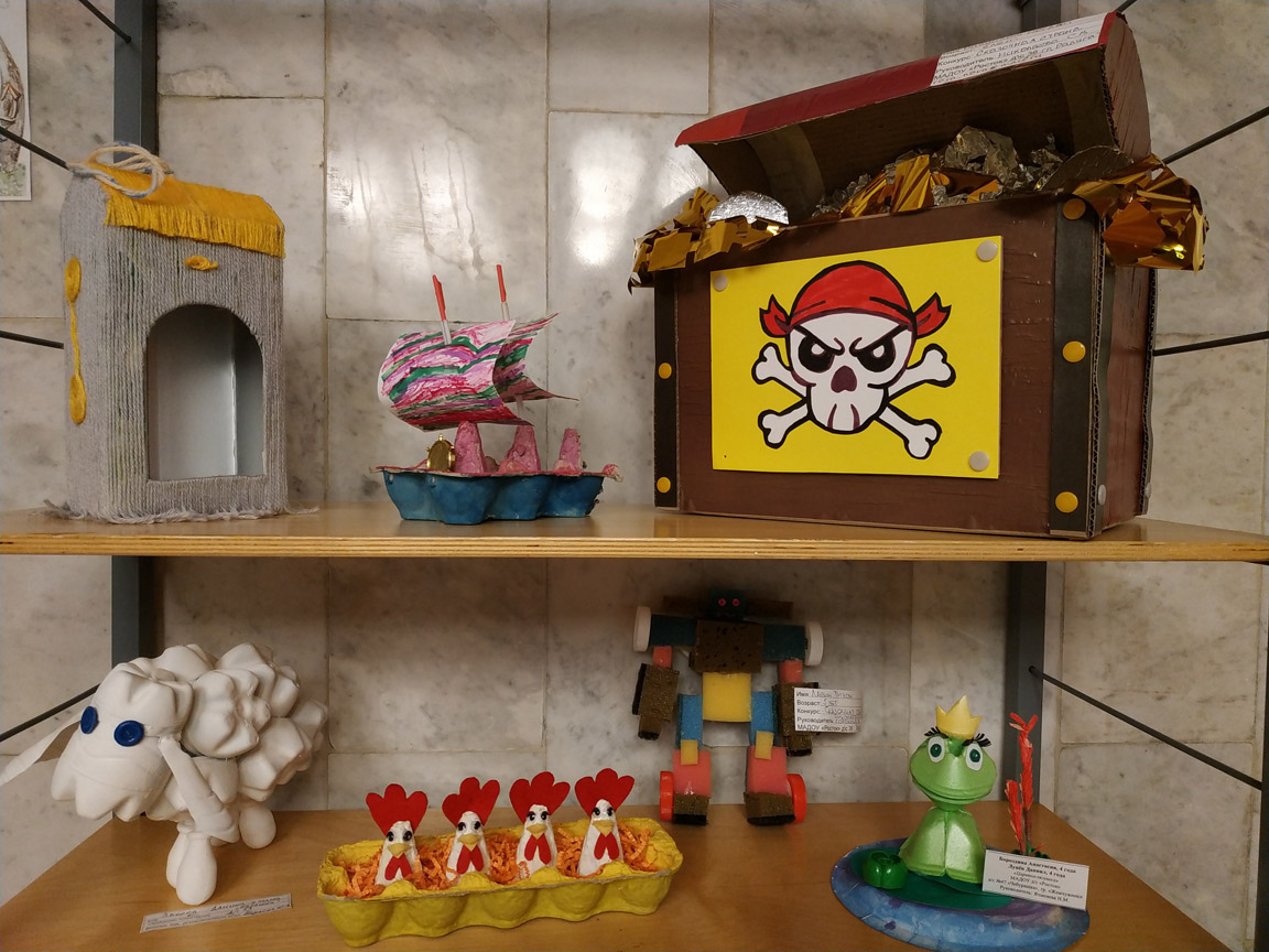 90 человек приняли участие в конкурсе – это дети дошкольного возраста вместе с родителями, а также учащиеся школ города. На выставке можно увидеть сказочные домики и сказочных принцесс, Бабу-Ягу и Царевну лягушку, Дюймовочку, золотую рыбку и много других сказочных героев. А сделали их ребята из упаковки из-под яиц, старых газет и журналов, пластиковых бутылок, губок для посуды и т.п. Приходите на выставку и оцените фантазию наших читателей!