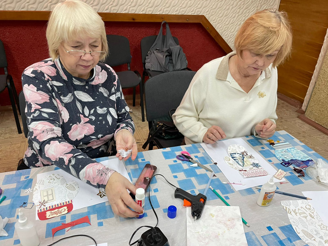 На встрече собрались представители старшего поколения, увлечённые декоративно-прикладным искусством и желающие порадовать себя и близких своими творческими работами. А мы, в свою очередь, подготовили разнообразные материалы и поделились секретами мастерства, используя технику скрапбукинга.