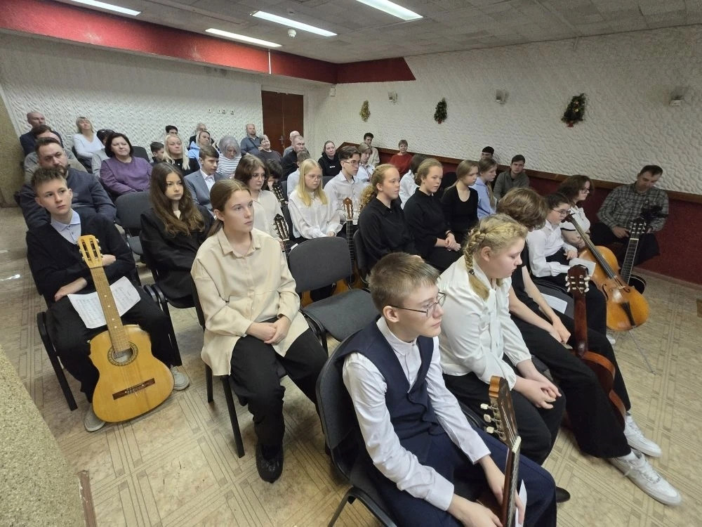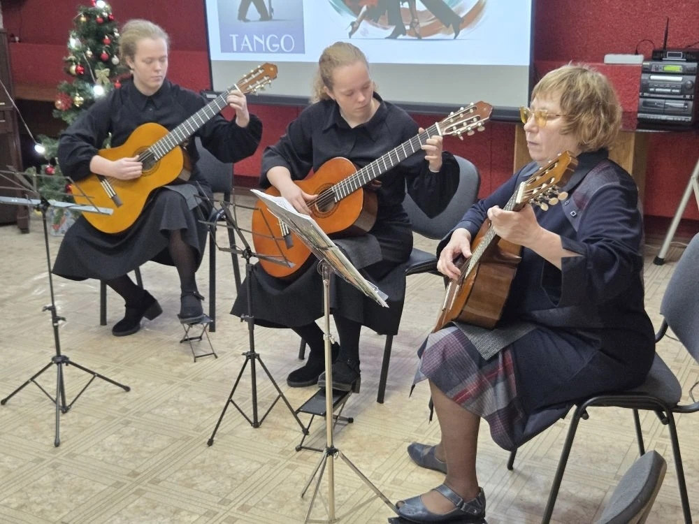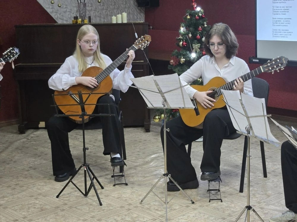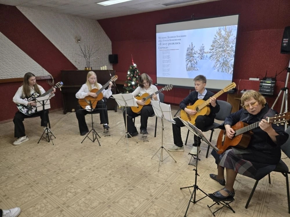 Участники студии «Обучение игре на гитаре» под руководством Виктории Ивановны Фильчаковой исполнили музыкальные композиции различные по стилю и жанру. Конечно же, не обошлось и без новогодней тематики. За окном падал снег, а в уютном зале было тепло и волшебно от звучания гитары. Зрители поддерживали юных музыкантов своими аплодисментами.