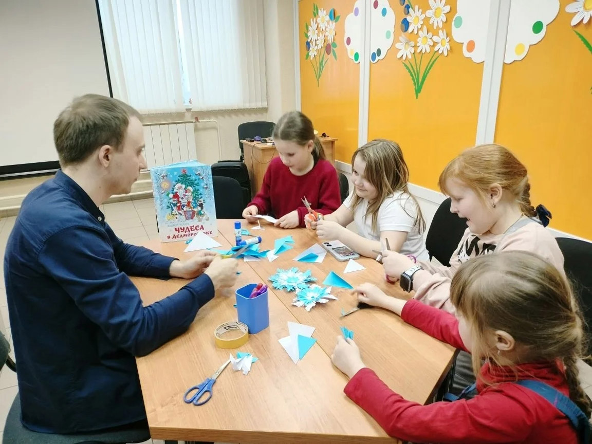 Дети с интересом слушали новогодние истории, а после смастерили поделку по мотивам прочитанных книг: книжную закладку "Чебурашка" и объемную снежинку.