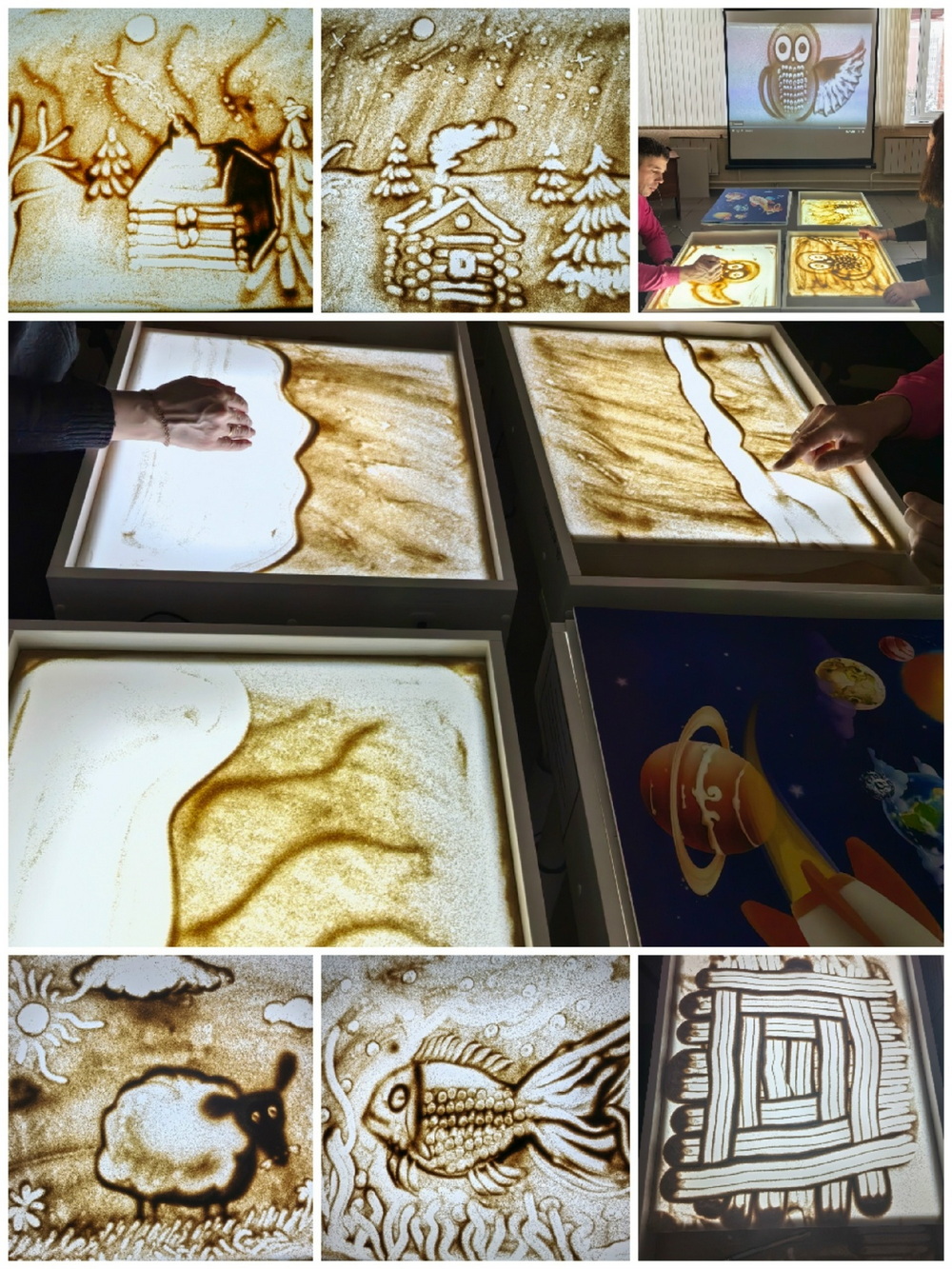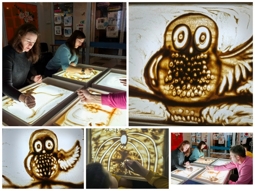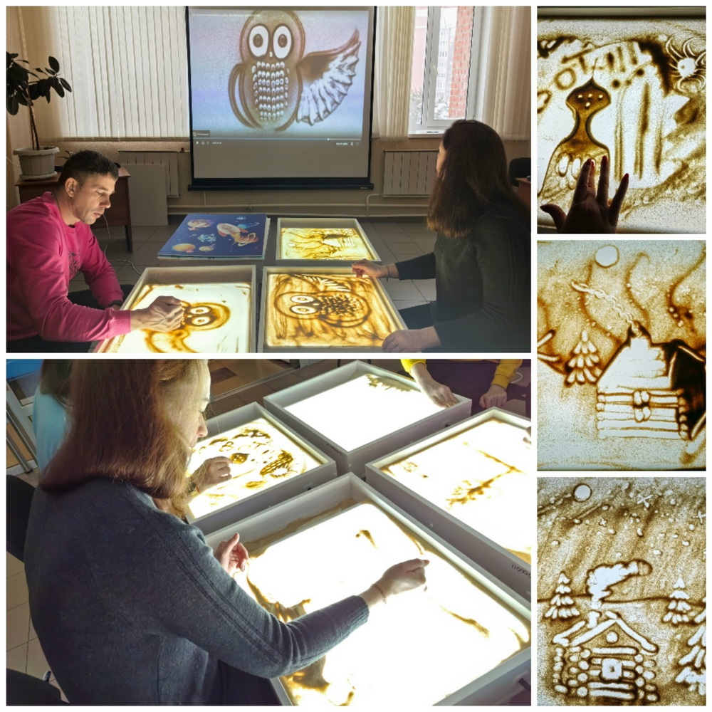 В студии песочной анимации «Рыжий лис» впервые попробовали себя в искусстве рисовать песком родители наших юных читателей. Под руководством библиотекаря участники создавали картины с птицами, рыбами, овечками и зимними пейзажами. Занятие получилось интересным и познавательным.