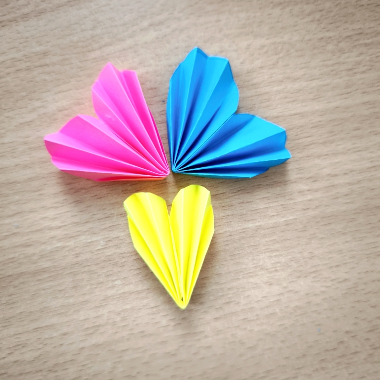 - 4 листочка цветной двусторонней бумаги (у нас это розовый, желтый, синий и светло-зеленый цвета, размером 9*9 см);