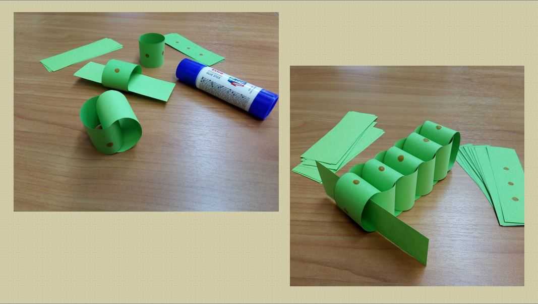 Теперь будем делать сборку деталей. Склеиваем края, делая кольцо. Чередуем детали с пятнышком и без пятнышка. Получается цепочка.