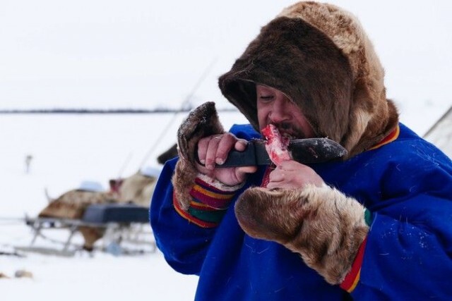 Жители северной тундры - это одни из самых главных сыроедов. Сырой в основном идет в пищу рыба в виде строганины с солью и перцем или горчицей. Также рыбу солят, коптят, вялят, морозят. Не менее вкусными считаются блюда из вареного мяса. Это традиционный ненецкий бульон – Евэй, который получается в результате варки мяса в слегка подсоленной воде и суп - Я, довольно густо заправленный ржаной мукой. Деликатесом считаются молодые рога оленя. Отрезанные мягкие концы рогов бросают в огонь и, спалив шерсть, скоблят ножом хрящевые участки. Такие лакомства в суровой тундре!